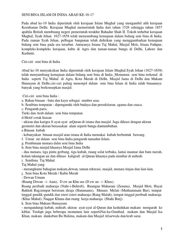 Seni bina islam mohd adib shujaa' ahmad. Seni bina islam mohd akmal bin din mohd firdaus bin ismail asihwiniy a/p. Di antara bangunan seni bina islam yang paling representatif terdapat istana, masjid, madrasah, karavanserai (tempat para jemaah dan pedagang bermalam), . Pada zaman pemerintahan bani umaiyah jugalah kubah diperkenalkan dan ia menjadi salah satu ciri identiti seni bina islam. Menurut ibnu khaldun sebuah peradaban yang baik dilihat dari seni binanya. Bumbung dan menara sebagai ciri seni bina islam. Menara ialah tempat muazzin melaungkan azan dan dibina tinggi dengan maksud memanggil orang . Ciri ciri seni bina islam di andalusia. View ciri seni bina andalusia.docx from sejarah 111 at smk bukit jalil.